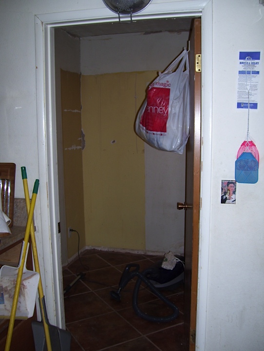 The utility room stood devoid of old washer and drier for months storing only plastic tubs of dog food and dog treats, and a few tools and lots of dirt. Then at the end of May my hubby and I decided to finally start the remodel on the room and turn it into a pantry closer to the kitchen than the old food storage area. Here you can see the old washer and drier hook-up.