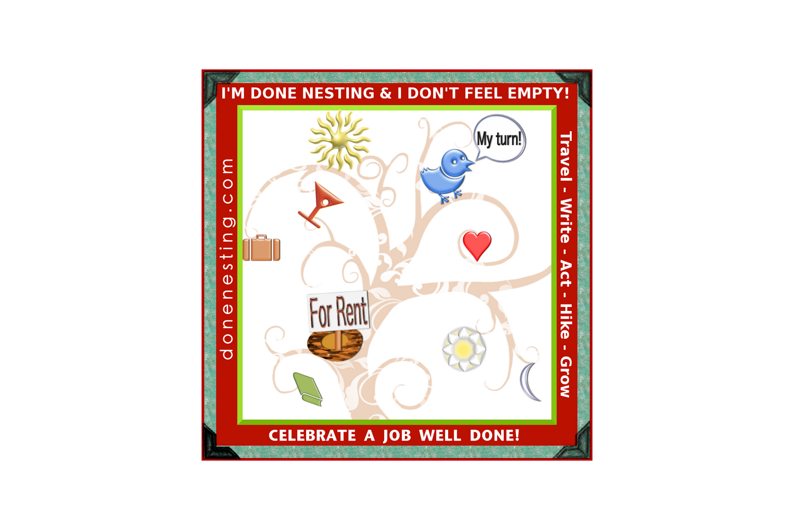 Anyway… I own the URL donenesting.com and I have been trying to figure out what to do with it. I think I have come to a decision and I’ve started working on the site. I’ve hinted previously that I really want to have a blogging, networking, blog-carnaval-ish site for folks who are through with the broody phase of their lives and are done nesting but really are not all that keen on the term “empty nest.”